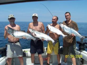 King salmon fishing on Lake Ontario continues to be productive. It's certainly not great but consistent action is the best way to describe it. Most trips we are taking 5-10 hits landing 3-6 salmon. The size of the king salmon has been impressive this season. 20-25 pound kings have been common. Trolling just north of the Salmon River off the eastern shore of Lake Ontario in 120-150' has been our go to fishing grounds. Hits have been coming 90-110' down on flasher/fly combos. A few salmon and steelhead have taking on mag stinger spoons run 20-30' behind the ball. Brown trout fishing has been very good for those looking for constant action. The trout have been around 3-6 pounds and there's plenty of them. A few kings have also been spotted in the Salmon River up to the hatchery. We have August 5,7,10,11,13,14,16,20,24,27,30 open for morning charters and almost all the afternoons for August are open. Our rates are the most reasonable on Lake Ontario. September and October dates are filling in fast so give us a ring and get in on the action.