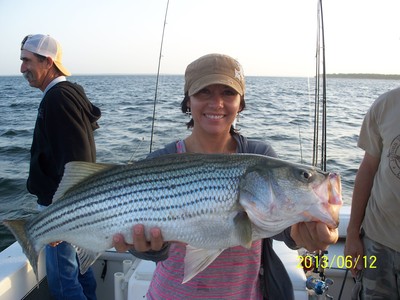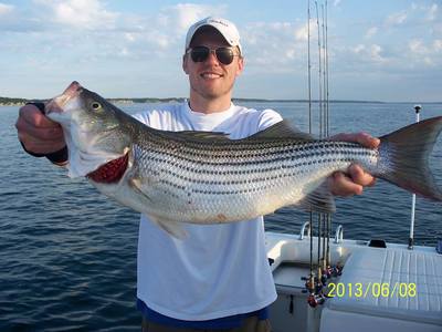 After catching stripers drifting in 20 - 4 feet of water, which is unusual for this late in the season, the fish have finally migrated to deeper water where they are normally found this time of year. We have been fishing in 60 - 80 feet of water with live shad. It seems we often "start" the fish at 60 feet. As they "load up" under the boat, we can raise our baits to 40 feet. We have been fishing from the damn to Washita point.