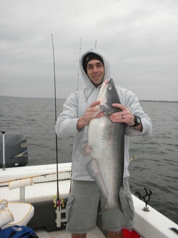 Sunday I only had one guy so I took the opportunity to bring along my wife Megan as she likes to accompany me as my deckhand when it is not too crowded and the weather is nice. My customer only wanted to catch a big fish and didn't care what species which made my decision easy. First fish the pressure was off, mission accomplished with a 20lb blue cat. We fished a couple more hours for cats and pulled another at 17lbs and a smaller one. We then went and hit a few spots for some striper and scratched him out a 10 fish limit. Not bad for a day's work.