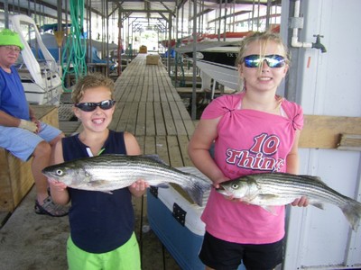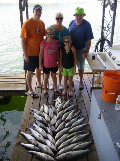 Wed Aug 19: Lake Texoma came alive with big stripers blowing up on the surface today. It was the best topwater experience I have had all summer long. I had 5 people with 2 cute little girls today. The fish stayed on top for 2 hours and didn't go down. There were 5-6 other boats chasing them but it didn't seem to matter. They were gong crazy! I would pull up to a school, cast out 5 rods and have 5 fish on as soon at they hit the water. They really kept me busy today casting 3 of the 5 rods and taking all of the fish off the hooks, I could barely keep up with all of the chaos. The topwater bite subsided around 9:00 and we had 33 fish in the box, all good fish, and threw back several over 20". We then threw an anchor just off of a near by ledge in 40ft and started catching them off of bait. Most of the fish on bait were over 20". Around 10:00 the fishing slowed and the girls decided it was time to go in with a few fish shy of our 50 fish limit. What an incredible topwater day on Texoma!