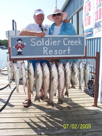 Before this onslaught of 100 degree plus temperatures, the fishing was fantastic. Fishing is , however, still good and I anticipate improvement with the more moderate weather being forecasted for the next ten days. The stripers are in their typical summer pattern. The fish will generally be found on the lower end of the lake in deep water (50-80 feet), but, sometimes will be found on the "flats" (20-40 feet). Most of the fish are being caught down rigging. The top water bite is good one day and poor the next with many smaller fish. Vertical spooning is working well when the fish are in tight enough schools. Fishing with live bait has been poor as the fish are moving to fast to keep up with them.