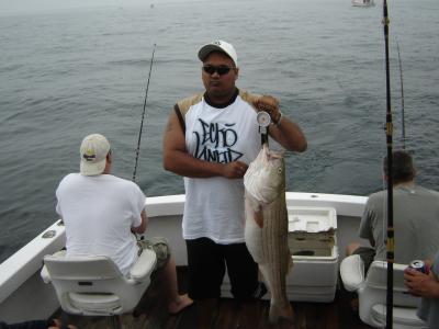 Daniel Maloy, from Claverack, N.Y., has coming fishing with me for the last 4 to 5 years. Most every season he and the group that comes with him do fairly well as far as striped bass are concerned. This year he finally hooked up on a really nice striper. This fish you see him with was 42 inches in length and a good solid 30 pounds. Not a bad fish. What am I going to do for him next season?