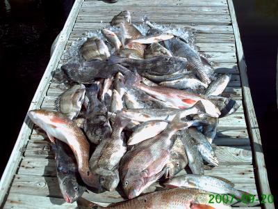 We ran into Capt. Frank's brother Harry and Butch while out in the Biloxi Marsh, and they had a great catch with 45 Trout and 10 Reds. They ran into a good school of Reds. They had many that they released (too big), and lots of popped lines. Sounds like fun.