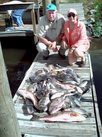 Late report for Thursday from the Beach. I had the pleasure of fishing with Wayne Felder and his wife Beth. They are a super nice couple that has done a lot of fishing around the world. Once again the NE wind was blowing so off into the Biloxi Marsh we headed after a stop by Campo's for bait. We started out where I ran into some good fish the day before and they both immediately were hook up. Trout, Reds, Drum, Sheepshead, Flounder, you name it they caught it. We had tons of action all day long, but did have a problem finding keeper Reds. There was no way I could keep a count of all the 14"-15" Reds and Drum we caught and released. They may have been small, but they were very aggressive and a blast to catch. They had a great time and filled the box with some fine eating fish. Total catch was 35 Trout, 4 Reds, 7 Drum, and 9 Sheepshead. All fish caught on Campo's live shrimp under a cork.