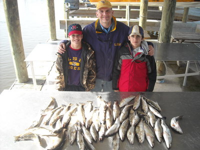 John Ledoux and son's made the trip to Hopedale from Mobile AL on Friday for a day of fishing with his boy's. The weather was perfect the first time in a week sunshine and light winds. Things started out slow just a few fish water temp was in low 50's. Around 11 am we got on a good trout bite nice fish taking plastics under corks water temp was up the 59. Made a few drifts in this one area putting ga few trout ion the box on each pass adding up to 45 nice trout and 1 barely legal redfish before calling it a day. Great day on the water
