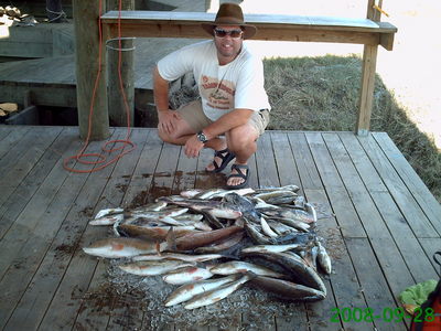 Late report from last Sunday. My guest for the day was Tom Blesi. He is down from Philadelphia getting a new office set up and wanted to sample our famous fishing. We headed over to a bayou behind Hopedale where the tide was falling nicely. The Trout were eating up the Campo's live shrimp on a Carolina rig. The Trout were nice sized and there were Drum and a few Reds mixed in. We were close to our limits of Trout as the action slowed a little so we went a looked for some Reds. First stop was full of small Reds. We then headed over towards Delacroix. Could not get the Reds going, but I cast out toward the middle of the lake and bam, nice Trout on. These were solid 18'-20' Trout. We kept a few to finish of our limit then caught a released a few. We made one more stop closer to the camp and got a good bite of Reds. Lots of under sized ones, but a few good ones mixed in. Tom had a great time and was amazed by our fishery. Total for the day was 50 Trout, 8 Reds, 10 Drum and 2 Flounder.
