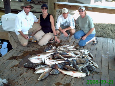 Sunday 9/21 my guests were Bobby, Justin, Connie, and Bonnie. Conditions for the day were a little tough. The wind was blowing hard, but at least the tide was up and we had plenty of water to work with. We started out fishing in a bayou and the action was a little slow, then someone flipped the switch and the Trout went nuts. Trout were flying into the boat. The fish were nice with plenty throw backs mixed in. Just like the action had started it ended all of a sudden. We made a couple of moves to look for more Trout and only picked up a few. With plenty of Trout on ice I asked if the wanted some Reds and all said YES. Fishing with live shrimp under a cork the crew put some nice Reds and Drum in the box along with plenty of missed strikes and fish that got lucky on the way to the boat. They had a great time and put together a nice box of fish. Total for the day was 60 Trout, 10 Reds, and 12 Drum.