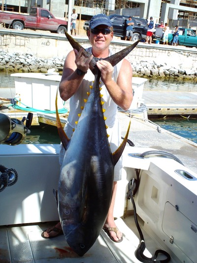 Well we told you that there were BIG fish here in Cabo and in the weeks leading up to tournament season we have reported large fish, such as the 780 lb'er caught aboard "Shambala" a few weeks ago....so we are into our first major marlin tournament of the season and the proof is in the pudding so to speak. Yesterday, Wednesday dawned with perfect big marlin weather....seas a deep blue mostly calm and a light chill in the early morning. Thirty seven boats lined up off of the arch to await the shotgun start of the Los Cabos Billfish Tournament, now in its twelfth year. The night before at the anglers meeting I had bumped into the guys from "Fisherman" the hot boat and team of the moment, a group of local guys from San Jose del Cabo and told tournament director Dan Jacbos, "these are the guys to watch; they are serious" and guess who pulled in with the biggest fish of the day....well yes, hate to say I was right, but it was team "Fisherman" with an incredible 713 lb black marlin for angler Daniel Fisher-Guerreo, which took him, believe it or not, just 32 minutes to boat. It was crazy, but "Sneak Attack" had also hooked a very large blue about 15 minutes after "Fisherman" had theirs on board and at this stage nobody knew the weight...so the "Sneak Attack" guys were probably thinking they had it made....it was a really big fish, the kind that wins tournaments...it took angler Shawn Gutterson and team 77 minutes to subdue the fish and get it into the boat. They took off for the scale was the fish registered 629 lbs; they also released a striped marlin. I do not remember two such large fish coming in on the same day in a tournament.