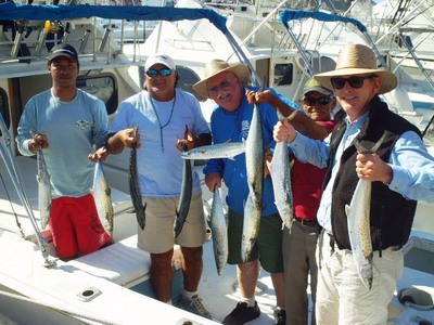 As to other species, we are still have sierra mania going on inshore with thirty percent of our boats catching between one to fifty four fish (majority released). This little tasty fish are everywhere close to shore and great fun to catch too. On the 27th, Shaun Green and friends from Mill Valle, CA had a lot of sierra action with a total of fifty four Spanish mackerel between 3 to 10 lbs; they also released one rooster fish. We had one wahoo this week, a 60 pounder for Ted Melson and friends from South Carolina aboard "C-Rod"; the fish took a black/red lure. Sharks are still in the area (be careful surfers!), this time the mako sharks were present at the 95 Spot. On the 27th, James Stoyko from Foster city, CA aboard "Valerie" released one mako shark estimated in the 100 lb class; this fish took a silver and black lure. A day before, in the same area "C-Rod" released another mako with, Ted Melson, out for his second day; as you can see he had a great time with Captain Abel. We hope to see you soon again!