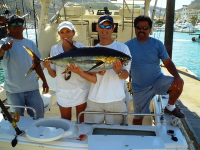 OTHER SPECIES: Dorado catches were fair with twenty nine percent of our boats landing between one to nine fish. The best day was on the 11th, when "Rebecca" boated nine dorado between 20 to 25 lbs for John Little and Lisa Nylund from Castle Rock, CO and Michael Arzewski from New York City. This same day "Adriana" also caught nine dorado for Marvin and Jennifer Shirley and friends from Tulsa, OK; they boated six yellow fin tuna as well. Tuna catches have provided entertainment to our anglers being the number one catch this week with sixty three percent of our boats catching between one to twenty one fish. Top tuna boat was "Tracy Ann" with twenty one tuna for Tamara and Lance Million from Palmer, Alaska; they found a school at ten miles out from the old lighthouse on the Pacific. Chris Tisornia from New Cannon, CT and John Meserve from New York City had a great day aboard "Attitude Adjustment" on the 11th, boating eighteen yellow fin tuna in the 20 to 30 lb class; they went to San Jaime bank. "Rebecca" on the 14th caught eighteen tuna too for Arle Long and Anni Hakman from San Antonio, TX. On the 11th, Steve Dick from Phoenix, AZ and Robert Schwab from Seattle, WA were busy boating fifteen tuna between 15 to 40 lbs; the fish took a combination of lures. Cameron Clements and Ben Liebetrau from South Carolina had lots of fillets to take back home as they caught fourteen yellow fin tuna between 20 to 40 lbs aboard "Adriana" on the 14th. Our total tuna count was one hundred and eighty nine fish. As to other species we had some rooster fish, wahoo, yellow tail and Spanish mackerel.