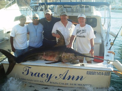 BILLFISH: Its marlin, marlin and marlin this week, making them the number one catch in Cabo on this report. We also need to make a special mention, as we had a great catch this week of the most valuable billfish, swordfish. Rick Morris & Bruce Kesler from Braselton Georgia did not know what they were in for when they boarded "Tracy Ann" on May 1st. Sure they had expectations of marlin, Cabo is famous for marlin...the weather was beautiful as they left the dock. They made a stop on the way out to pick up some live bait, caballito or horse-jack was the only type available, so they dropped ten into the bait well and were on their way to the 11.50 spot, which had produced some fish the previous day. It wasn't long before they spotted a striped marlin, cast a live bait to it and soon had a hook up. They fought the fish to the boat and estimated it at 170 lbs before successfully releasing it. They then proceeded to troll again as did other boats from our fleet fishing the same area. Valerie and Tracy Ann spotted the swordfish sunning itself on the surface at the same time. The guys on Valerie cast a bait but the fish did not take it, they were circling back to offer another bait, when Tracy Ann swooped in right behind them, cast a bait, which landed right on the bill of the fish and it bit; probably more from annoyance than hunger....but who cares, they were hooked up. They struggled with this very strong fish for over six hours before finally landing it, making it back just before dark. The crew was thrilled; swordfish are such a prized catch. This one was estimated at 270 lbs. Chic McsSherry however, the angler on the Valerie was not thrilled. Chic is from Scotland and a long-time friend and regular angler, he whined to me "That was my fish, I saw it first, it was my fish". This is one of the few billfish he has not caught and this would have been a crowning achievement for him, but that's the way it goes sometimes first-timers get them. Nevertheless, Chic didn't have too much to complain about; he ended up releasing five striped marlin that day. Back to marlin news, SEVENTY FOUR percent of our boats caught billfish this week. Top marlin boat was the "Valerie" and their best day was on May 1st for Chic McSherry from Scotland, as we mentioned before he released five striped marlin at the 11.50 spot; the fish took a combination of ballyhoo and caballito. On the 5th, they also did very good for Mike & Shannon Giles from West Jordan, UT releasing three striped marlin between 120 - 150 lbs at out for the 11.50 spot by the Sea of Cortez. This same day, "Tracy Ann" did well too for the Heitmann family from Clarkston, WA as everyone had a chance to release one striped marlin, with a total of four stripers back to the water. On the 4th "La Brisa" had a triple marlin day for Kasey and Nikola Peisley and friends from Eagle Mountain, UT; they came on one of the numerous cruise ships that visit us and had a wonderful time fishing. A day before, Dan and Jeff Sopczak from Indiana also had three striped marlin released aboard "Tracy Ann"; fish took live bait caballito and ballyhoos. Pisces anglers caught a total of 50 striped marlin all released and one swordfish (270 lbs approximately)