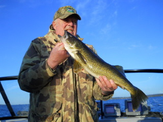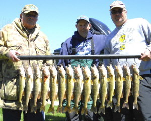 Well, after yesterday's ridiculous winds, I was hoping today would be nicer. And nicer it was! The wind was much more manageable today, especially in the early morning. I had Dale DeWildt and his son Mark out again and we had a much better bite. As we were working on getting our third line out...there went the first board and soon after that the second board went back. Just like that we had two keepers in the box in the first 2 minutes of fishing. We proceeded to land another 5 or six keepers while trolling Walleyes Choice harnesses behind bottom bouncers in the upper bay. We lost several real nice fish too, not sure why, but we had a lot of fish come un-buttoned today. The wind really started to crank up around noon time, so we switched over to drifting with floating jig heads tipped with crawler halves and managed to land a bunch more fish in deeper water. Most of our fish caught on harnesses came from 17 to 20 fow and all of our drifting fish came from 27-29 feet of water. Many guests of ours staying at the resort have been doing well also, with most of the fish averaging 16 to 19 inches. We did release a 23 1/2 incher today, that has been our biggest fish the past two days. A few nice perch have been caught as well the past couple of days. Our best color harnesses by far were a couple of new ones Capt. Keith Wils has this year. I'm not exactly sure of the numbers, but I'll get them and post them on here tomorrow. Here's some pictures of today's trip. Good luck from all of us in the Bay de Noc area.