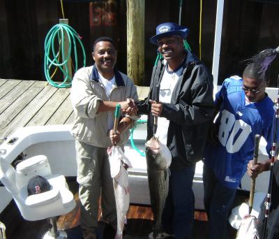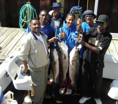 Lewis called me a couple of weeks ago and wanted to book a half day trip on the 9th of August. He wanted to get his youngest son out, who as I remember was too young to go the last time I saw them. Well, now he's past the mark of a young man, he's full grown. The crew Lewis brought with him was Chuck & Herbert Chambers, long time friends of the family, Marcell and Dante Bittle, and Jonathan Brome another family friend. Even though they did bring a banana, lady luck was on their side. They all were treated to some nice bass fishing with a smattering of bluefish thrown in. A good time was definitely had by everyone.