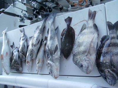 Mostly catch and release, but the avg. were 6-12 sheepshead 3-6lb, 15-25 black drum 4-8lb, couple flounder, reds, specks, (white trout and ground mullet) were thick but we were looking for lil more fight.