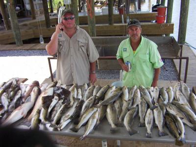 Day Two left early and headed for the LOG HOLE. Bite was slow and lots of boats moving around kept things from developing. Blasted off and headed way out to escape the crowd and found the trout eating up LOGS again flying in the boat, they sounded like bricks hitting the deck. After filling the limit we decided to make a run in and pick up some lunch MARSH REDS and Puppy Drum. Two stops and we had what we needed. Larry Romero cooked up the fillets on the grill while we cleaned fish. Fresh Caught and grilled reds on the dock AWESOME! All fish caught on live croaker and shrimp.