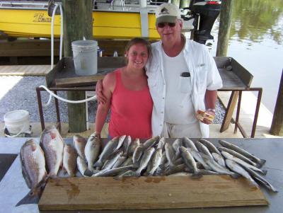 May 1,2007 Skip and his daughter Alex were back after a years delay due to the mess caused by Katrina. Skip was one of my first customers and has fished with me for the past 7 years; it felt good to have him on board again. We started out under the birds a lot of small fish and gaftops but plenty of action, just what the doctor ordered after whole year of no fishing. We worked thru the small ones but caught fish all day long. Finished doing what Skip likes best, Throwing spoons for red fish. Put a few in the box and headed for the dock. Great weather and fishing with a good friend and his Daughter it just does not get much better along with a nice box of fish.