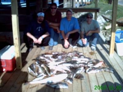 Lots of big fish Saturday at the Beach. I had part of a large bachelor party group. On my boat were Jason, Glen, Steve, and Mike. The weather was very nice and the tide was low and falling hard. We started out in the Lake Robin area. Fishing with Campo's live shrimp under a cork the guys started outing some very nice Trout in the boat. The action was not that fast, but the quality of the Trout more than made up for that. There were a bunch of Rat Reds mixed in with the Trout and a few keepers too. After this bite died out we made a bunch of moves and never could get on another good Trout bite. Headed over towards Oak River and got on a good bite of some fun hard fighting fish. Fishing on the bottom with a Carolina rig it was as fast as they could get them in the boat action. Drum, Sheepshead, Reds and a few more Trout filled up the fish box fast. The Okuma reels and Power Pro line got a heck of a work out, and the guys had a blast. Total catch for the day was 50 Trout, 30 Sheepshead, 12 Drum, and 8 Reds. The guys were treated Capt. Frank's fried Sheepshead while the rest of their catch was cleaned.
