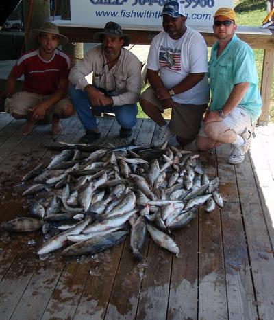 Lots of fun and lots of fish on the Beach. I have not been posting many reports lately. I have been very busy both on and off the water. The Trout fishing outside has been outstanding now that the winds have laid down and the Reds in the marsh have been good when the wind has been blowing. Yesterday Pablo, his son Gabriel, Paul, and Broady killed the Trout out in Breton Sound. Our first stop produced 115 Trout along with some big fights from a monster Red and a couple of big Jacks. One more stop and we finished our limits. The Spanish were thick and we went through a lot of hooks. All fish caught on Campo's live shrimp on a Carolina rig. Fun time on a pretty day.