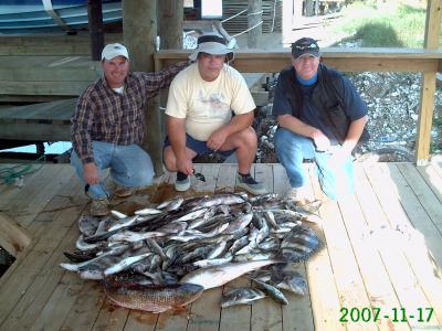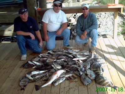 Lots of fun and lots of fish this weekend on the Beach. I had the pleasure of fish with Pat Driver, Cecil Bolton, and Bill Klutz both Saturday and Today. They were part of a large group that spent the weekend at the lodge. Saturday things started off kind of slow. We made a bunch of moves picking up a few fish at each. We then jumped on into the Biloxi Marsh, made one stop and done. The Trout were aggressive and nailing the Campo's live shrimp under a cork along with Bayou Chubs and DOA shrimp. Total for day one was 100 Trout, 2 Reds, 1 Drum, 1 Flounder, and 25 Sheepshead.