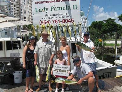 First thing on the list this morning = cut fresh strips! Keith, the mate, cut tons of strips for the day ahead of us. Repeat anglers, George, his wife Deborah and their two kids, boarded the LP II to fish with Captain David Ide. We headed out Crazy Greggs Marina making our way towards Lauderdale Marina to pick up live pilchards for dolphin fishing. Live bait was in the well, we were ready to go. We ran 5 miles offshore looking for debri and there was none to be found. As we continued to scope out the area, trolling gear was in the water. Finally after two hours of trolling we ran across a nice current edge with a weed line in 750 feet of water. Weed patches are usually a good sign! We spotted 3 real nice size mahi - mahi swimming right on top. I turned the boat around, pitched live pilchards out and before we knew it, we were catching dolphin left and right. George and his family reeled in at least 30 mahi, about 10 were too small, and we walked away with 20 good ones....not too shabby. Time fly's when your having fun! Heading back towards the dock for our afternoon trip, George and his family caught a barracuda. This morning was one of the most exciting days of dolphing fishing we've seen and had in a long time!