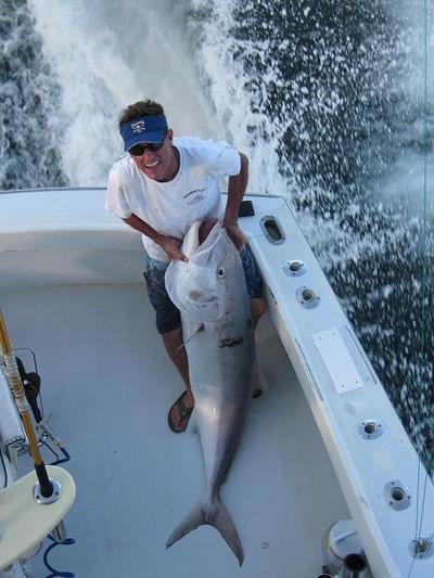 This afternoon we had six people on a split charter. First three baits in the water we got the bite; 2 bonitos and a blackfin tuna. To spice it up for our anglers, we ran north, dropped our two big bonitos down hoping for a BIGGER bite of some sort. We soked them for close to an hour and didn't get a bite. Plan B - Wreck fishing. We hit 6 wrecks with live blue runners, but it didn't appeal to anybody down there. One more wreck was in route, we dropped a dead bait down this time and it did the trick. We weren't sure what we got ourselves into; 15-20 minutes had gone by and I thought we were hooked on the wreck. The bite was that big. It took a good 45 minutes to fight this fish. Our angler reeled in a 95 lb Amberjack. It was HUGE!