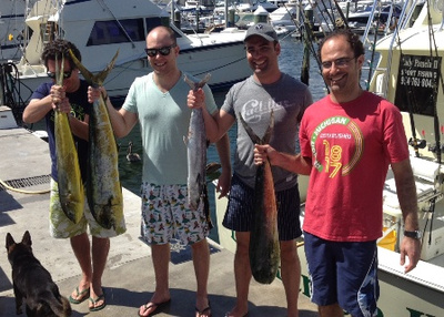 Mahi-mahi is the Hawaiian name for the fish Dolphin, also known as El Dorado. According to Wikipedia, Mahi-mahi means very strong which suits this fish well. Even small Dolphin can give quite a fight on hook and line. A bite came fast and furious, a Mahi had swam into our baits and eaten one… While Justin hooked that one, another ate the long bait on the side and with 2 mid-teens fish on, the fun began with our English/ Italian language barrier.