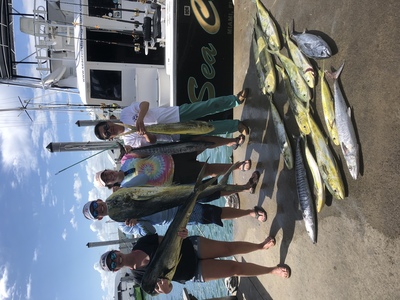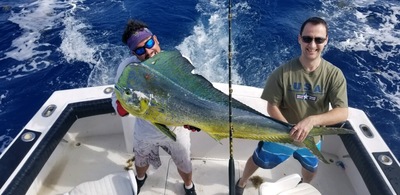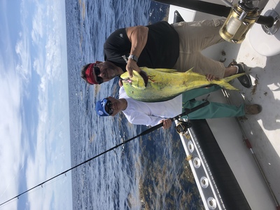 We also had a beautiful opportunity that we took a vantage of The opportunity as we were pulling in a cow mahi-mahi she must’ve been 15 pounds Hey bull showed up over 25 That’s when we took the opportunity and presented that fish a Pilcher had Jake on 15 pounds spinning tackle what a beautiful site that was when I got to see that beautiful fish eat the Jig on the surface