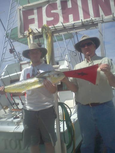 We stopped to pick up a dozen live Goggle Eyes from T&T Bait in the inlet in Fort Lauderdale and set out to do some kite fishing with the live bait. Winds were out of the east, southeast at 10-15 mph, 3-4 ft. seas. I headed towards one of our 34 artificial wrecks that sits off of Fort Lauderdale in 265 ft. of water. We put up two kites with two live Goggle Eyes from each kite and one Goggle Eye from the rigger with a spin on lead. Our first fish, a 12 lb. Mahi Mahi on the right long, was brought in by Tyler. The fight was quite exciting for Tyler with the Mahi Mahi jumping out of the water a few times – a good spectacle to watch. We reset our kites over the same artificial wreck, and as we were focused on the live Goggle Eyes, a Hammerhead Shark – 8 ft. long – lethargically was heading south right towards our live bait. As the Shark swam within 3 feet of the live Goggle Eye, the bait frantically tried to get away. This Shark must have just fed because, to our amazement, he just continued along his merry way and ignored the bait. Our next catches were a couple of Mahi Mahi's, and both father and son brought in each fish, as Jackson, our mate, put both in the fish box. A dorsal fin appeared on the left long kite and it belonged to a Shark. Tyler was the angler, and he jumped into the fighting chair; the Shark ate the bait and the fight began. Tyler did a great job bringing the Shark to the side of the boat – pictures were taken and the Shark was released.