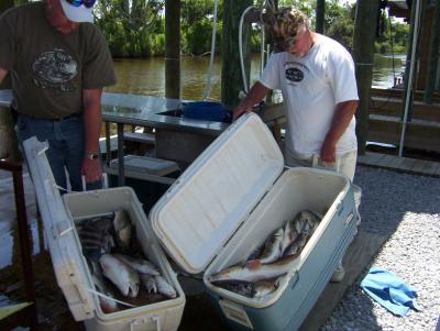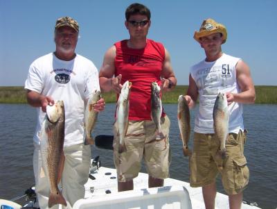 2 Boat trip today! Billy Johnson and crew took a day off from sorting mail for the US Postal Service to sample the fishing in Hopedale LA. Well we got decent weather and LIVE SHRIMP which made fro a great day. We fished the outer bays and close in rigs and put together a good catch of fish with trout up to four lbs. live shrimp under corks and on the bottom had the trout coming in the boat steady. Finished up working some points in the marsh to top off the boxes with redfish. Really fun trip great group of guy's too. Look forward to seeing these guy's again this fall. Thanks to Capt. Nathan for helping out with this group.