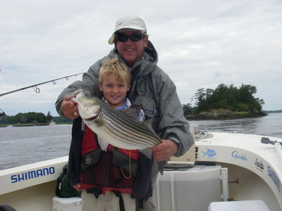 Reports from southern Maine have been mostly good...like the midcoast region the fish are not everywhere yet...the name of the game is location...location...location. If you can find a good school of fish you're going to have some great action. For the casual angler as well as the seasoned traveling angler, it usually pays big dividends to hire a local guide that's on the water 24/7...a little local knowledge can shorten the learning curve in a big way!!! Check out what a very frustrated local Kennebec river fishermen said after spending just 4hrs with me last season..."Captain George: The pictures are great, but the lesson and knowledge are immeasurable. You've changed my whole outlook on this great sport. What I've learned today will save me tons of money and so much frustration. I can't thank you enough" ,~ Ray Paradis