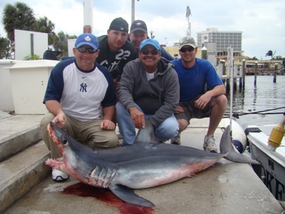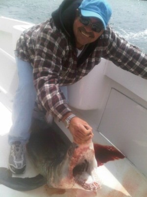 Here's a little advice from the crew aboard the Hooked Up: if you've got a big shark calmly resting on your deck don't touch his tail. He went nuts and made a complete mess of the boat. We did manage to grab him right at the eye socket and pointed him toward the open door. We squirted the fresh water hose at him and he just swam out the door and was in great shape because he disappeared like a bullet.