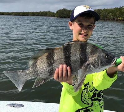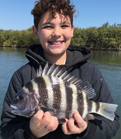 With the cold water holding on late this year the Sheepshead have been biting good, young Andrew with a nice one.............