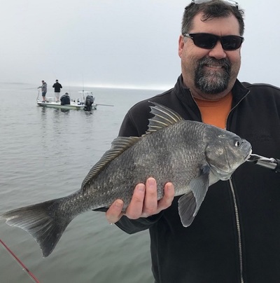 We were catching a bunch of smaller runt Redfish on the edge ofa Lagoon drop off when Rusty hooked a good Black Drum.................