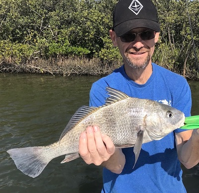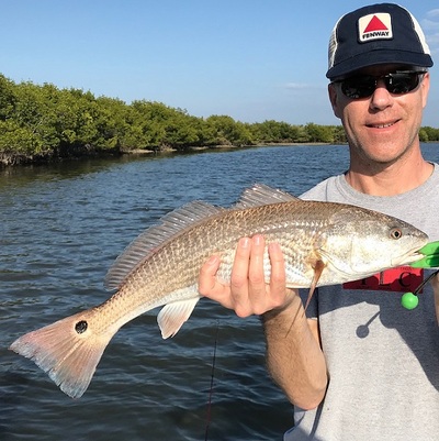 Spring 2019 has arrived to the waters of the Indian River and Mosquito Lagoon here at New Smyrna Beach, water temperatures are up to the 70’s F in the intracoastal waterway and the mid 60’s in the ocean surf line, bait fish are returning the lagoon coming up from the south as the temps rise, coastal migratory game fish also starting to be caught, including Jack Crevalle, Bluefish, Pompano, and Ladyfish, our local resident fish Seatrout, Redfish, Black Drum, Mangrove Snapper are also returning to their normal locations after spending the winter hiding in the cold water spots. The spring shrimp run is starting with lots of fish focusing on one of their favorite foods the local shrimp. Water is still clear here in the north Lagoon and backcountry so artificial lures and flies are working with good visibility for the fish to see the “fake” baits. Kris from Maine was out with the family recently with me in the backcountry catching many different species on shrimp, dad got to catch a nice Redfish which we released to grow up and become a larger spawning fish some day……………….
