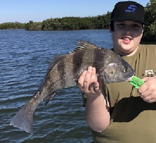Spring is knocking at the door with fishing patterns here in East Central Florida on the Indian River and Mosquito Lagoon. As the water slowly warms in the late winter jump starts baitfish and gamefish migration back to the north after wintering further south. Bait like glass minnows, mullet and pilchards included and game fish being Jack Crevalle, Bluefish, Ladyfish, Pompano, Spanish Mackerel. Our year round resident fish like Seatrout, Snook, Redfish, Black Drum, Mangrove Snapper and others also become more active with rising water temps. Surface activity also increases after a winter of most sea life hugging the bottom, add the spring shrimp run in the mix for more fish food, available live bait and surface attacks by the game fish makes spring one of my favorite seasons for local fishing. Long time regular clients from Ohio out with me recently, Carter with one of the fun Black Drum he caught and released …………..