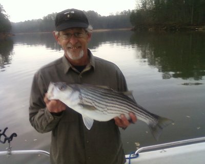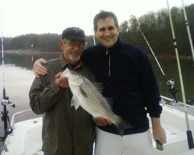 Today I fished with Mike and his Dad Jim. Mike is a 8Th grade school teacher in Cobb County and Jim was down from Pittsburgh visiting his son and his family. The early morning action was great. It has been a long time since I have seen this many fish busting shad on top. And the best part of it was they stayed up for about and hour and a half. We could not get our baits 20-30 out behind the boat before hooking up. It was just crazy out there this morning. The action lasted for about 2 hours. I only had time to snap a couple of pictures but we had to boat somewhere around 20+ fish. I still have a few days open this month give me a call at 770 827-6282 if you would like to book a trip.....