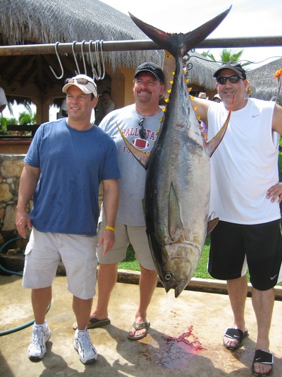 Juan Castro from the Santa Barbara area hooked into a black marlin while trolling a small tuna on the Outer Gordo with skipper Chame Pino on the 26 ft. Super Panga, the "Killer II". This was their second morning out targeting larger marlin or tuna, the first day they did not have any luck, even though they did see a pair of big marlin feeding. The second day they were more fortunate, things went their way. Juan landed this black marlin in a mere 28 minutes, apparently the fish became gill wrapped and quickly expired during the ensuing battle. Back at the La Playita weigh in station the black was officially weighed in at 495 pounds. Several other black and blue marlin were also landed throughout the week, most of them weighing in the 250 to 350 pounds range, the majority of them being hooked in the vicinity of the Gordo Banks.