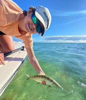 Richie is a boater while his 14 year old son is a hard core fisherman from AL (spoiled in the college football world!) so this trip was for Max and Max wanted bonefish. I took them to a flat that has been producing and we got to work. It started ugly with Max going 0 for 2 before Richie got his first bonefish. Oh, oh. After me feeling some stress because I really want Max to land one, losing one 2 feet from the boat doesn't count, I see Max set up and the reel sing. Yes, wait, no yes, let's wait until he lands it. Max did a great job fighting his fish and listening to my suggestions and then the silver bullet we all love slipped into the landing net. YES! Wanting to try something different I took them to a spot where they caught 5lb jacks on every cast and the bass fisherman in Max came out with the hook sets. Congrats Max!
