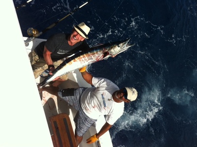 The transition is clear with higher SST, More bait (bonitos and Skip Jacks) and the less rain creates more blue water close. The bite has been mixed, some king macks , mahi mahi, wahoo and of course the mighty barracudas. With the full moon of the May 22 the first Blue Marlin encounters. Smaller blues in the north east Irene went 2-0 May 20 two days before the moon and We while fishing the south west of Vieques May 23 went 1-0. The fish came really finicky and only liked the Horse Ballyhoo and not the Teasers or Lures.