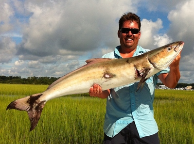 By mid May the Cobia start to show up around Wrightsville; one of my favorites! I forecast that the Cobia will be here a little early this season. I look for Cobia around inlets, shoals and bait schools; near shore/offshore reefs and ledges are also a good place to look too. With the water being so clear it has been easier to see those brown logs in the water. We are throwing big jigs (Blue water candy), swim baits and live bait to the Cobia. Color really does not seem to matter; but "go bright"! When I'm not sight casting for them, we are fishing around inlets, shoals and near shore artificial reefs. I float fish, bottom fish and kite fish in these areas with live menhaden, blues, pinfish and mullet as bait. Sometimes a great bonus fish when fishing for Cobia is a nice bull Redfish. You can chum if you like, but the sharks and rays will come and they will come in numbers!