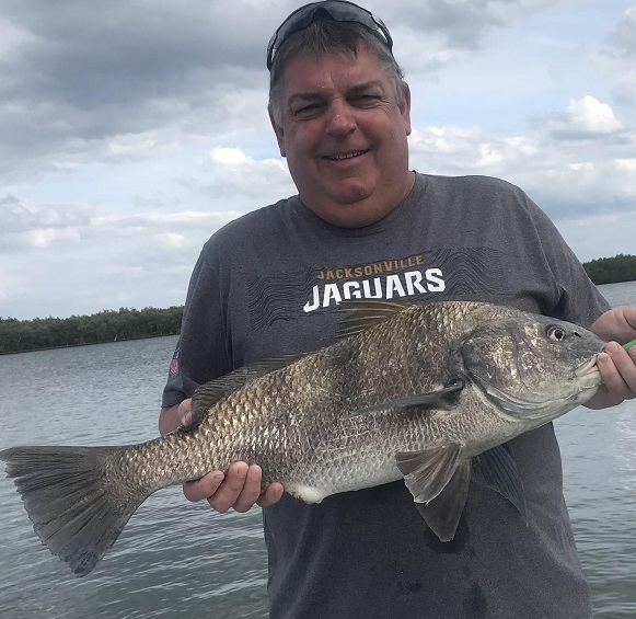 Spring has arrived to East Central Florida coastal and intracoastal waters, as water temps rise, bait fish and game fish migrate north after spending the winter further south along the Florida coast, glass minnows, mullet, sardines and pilchards for bait, Bluefish, Jack Crevalle, Pompano, Ladyfish, Spanish Mackerel are some of the inshore game fish which move north along the coast and in the inracoastal. Spring is also shrimp run time on Indian River, so shrimp are one of the most useful bait, our local residential fish also become more active as the water warms, Black Drum, Snook, Redfish, Whiting, and others are regular spring catches. Earlier in the morning can be good catching again as winter is over with warmer water. Long time regular client Darin from Missouri caught and released a beautiful 28” Black Drum recently with me, at approx 10 lbs a great battle on light tackle …………..
