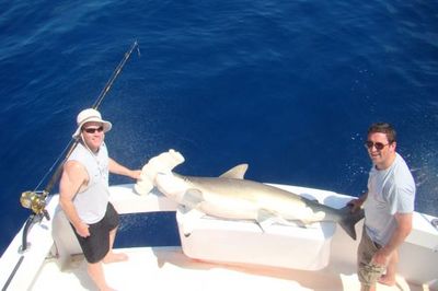 Than all of a sudden one of our deep rods bent over and line started peeling off. Holly Cow we got another big fish on just like that. This time Brain jumped in the chair and the fight was on. After a good 15 min Brain was worn out so Piere jumped in the chair to give him a hand. 10 min later at last this big hammerhead shark was at the side of the boat. J.J. managed to get 2 out of the 3 hooks out of the hammerhead and we watched him swim away in great shape.