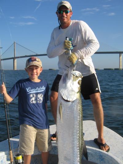Tarpon. Numbers, size, well all I can say is this fish is on. Every trip out the past week we have managed to boat and hook a bunch of Tarpon. It doesn't get much better then this for the Tarpon. I can talk about one trip in particular. It was this gentleman and his son's first trip out in the great Tampa bay fishing. We started the morning off with some great Tarpon fishing. We hooked 5 and finally landed the last fish, well what I thought would be the last fish. It was about a 100 lb. fish. Both father and son managed to pull this great fish into the boat. Then the young man wanted to catch a Shark really bad so I said we could give it a shot. From the Tarpon we went and fished for Mackerel for Shark bait. This was fun in it self every bait in the water had fish on and we managed to catch a mess of Mackerel. In the midst of this fishing the guy pulled his dead bait in I told him the bite was good just put it back out and see if a fish will hit it. Well a fish did it was a 50 lb Tarpon and we managed to fight this fish for a few minutes before he broke the light tackle off.
