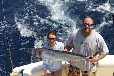 This morning we all woke up around six and got the boats running and ran 6 miles to dinner key marina where there were 30 charter boats all pulling in at the same time to pick up our clients. It was a little busy trying to find our people because everybody was schedule to a pacific boat once getting all this started out we were off to the races. We ran out of fisherman's channel and started fishing as soon as we got to a 100 feet of water. We where fishing six lines with fresh Bonita strips and sea witches. The Bonita's were solid we must have caught 25 Bonita that day trolling an a few short king mackerels that we had to throw back. Then around 1 PM we had a nice bite on the long right rigger bait the line was scream in off the reel the girl Sam jump into the fighting chair and reeled in a 40 lb wahoo a reel nice fish. The wind was out of the south east at 5 mph an fishing was a little slow for the fish we want to catch so we decided to go into the shallows witch are 15 to 30 feet an get up into the tower of the boat that is 30 feet above the water an look for cobias because they counted in the tournament. It's a little late for them to be in there this time of year but it was worth a shot it wasn't a hour an we saw a 50 lb cobia but we lost him in the grass flat and when we were trying to find the cobia we saw a sailfish in the sand so we threw every type of live bait we could sardine, threadfin, ballyhoo, pilchard, goggleye the fish would not eat we started to pick up an run to make the weight in and my friend walle saw a nother sailfish 100 yards off my bow we caught get there before him he hooked the fish an caught him it is cool to see the sailfish in that shallow water like that.