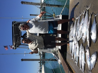 It was really a nice morning we had it out of the end that it was a little choppy we had a north to northeast winds 15 to 20 it was 2 to 3 on the reef and 5 to 6 way offshore so we decided to stay on the reef and we were well rewarded with this beautiful catch of Kingfish and Bonito we started the day out with the five rod spread including ballyhoo on top . We also had to planers fishing about 60 feet below the surface and we had another one way out back fishing 30 feet below and it was lock load all day
