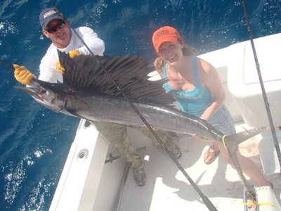 Today we got a call at the last min from a Denise who was down from Longmeadow Mass visiting her son Brent and his soon to be wife Brianne who both live down here in Sunny South Florida or should I say what supposed to be Sunny South Florida is. Today was not such a sunny day down here in fact after we got out there the weather got downright nasty. We ran down to the south off the coast of Holly Wood Florida and set out both our kites with live baits suspended from them and now we just needed a big game fish to swim up and eat one of these live baits. After fighting with our kites a bit due to the rain and wind we finally got a big sail fish to bite. Brianne wasted no time jumping in the chair and the fight was on. It was a back and forth tug a war for a good 20 min till Brianne finally got her big catch to the boat. We got a quick measurement and a couple of quick photos to have a replica mount made of her fish and watched him swim away in good shape to fight another day.