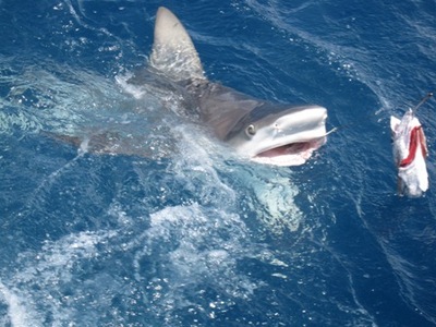 After quite a bit of waiting we finally got a bite on our deep line that was on the bottom 350 down. Joe was eager to catch and mount a big shark so he wasted no time jumping in the chair and the fight was on. I've got to say while the fish pulled hard he never really took much line off the reel and I figured it was a big reef shark of some kind.
