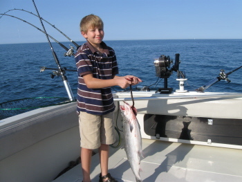 West wind is providing 45 degree water near shore with steady and consistent action for all species. Most presentations are working and anglers are enjoying action on Chinooks, Coho and huge Lake Trout. We had a Laker over twenty pounds this past week. Set up in 40 feet and run spoons 15 to 35 feet down for some of the best fishing of the season. Eleven almost twelve year old Adam Brigmann battled this 11 pound 4 ounce Coho to a successful end.
