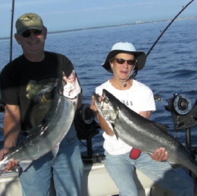 Lakers dominate the catch with some Chinooks and Rainbows. Not much has changed for the last month. To get my fish reports and how to videos first go to http://www.jimhirt.com By subscribing you will keep ahead of the other anglers. When I post you will get it fast! Ron and Valerie Dent landed this double of a Rainbow and Chinook. Good battle great charter!! Both fish were taken on Reaper Magnum Fish n Chip spoons.