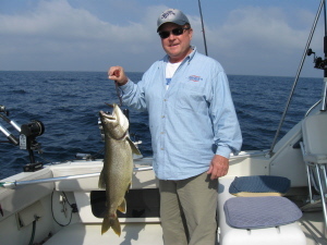 East wind continues and the fish have adjusted to the warm water. A temperature break has set up in 110 to 195 feet of water. The best action for Chinooks and Rainbow Trout is 75 to 120 down. Church Tackle lighted 8 inch Revelators with green or white flies or magnum spoons are taking all size fish. Shore, gap and near shore action for pier and small boat angler's is picking up with reports of four-year-old kings. Lake Trout are part of every catch with some in trophy size. Gary Foy caught this lunker on a Vulcan Magnum Silver Lizard.